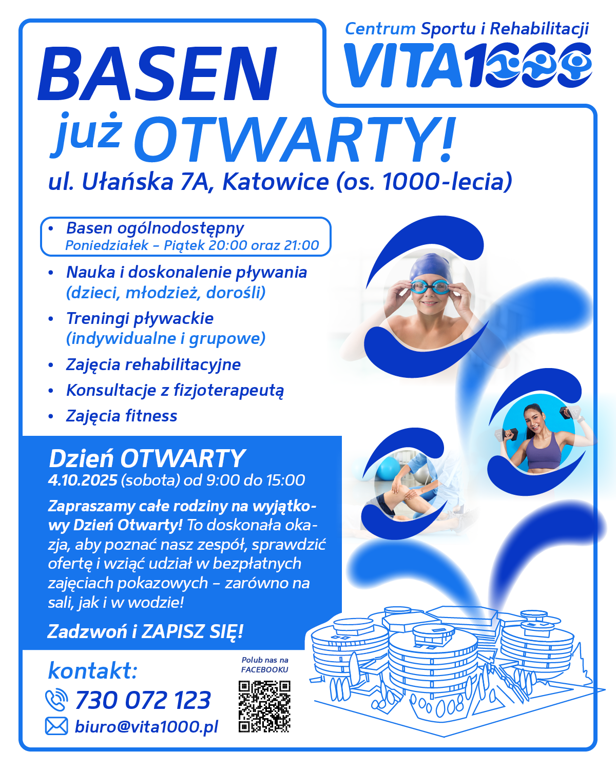 Nowo otwarte Centrum Sportu i Rehabilitacji VITA 1000 zaprasza całe rodziny na wyjątkowy Dzień Otwarty! To doskonała okazja, aby poznać nasz zespół, sprawdzić ofertę i wziąć udział w bezpłatnych zajęciach pokazowych – zarówno na sali, jak i w wodzie!